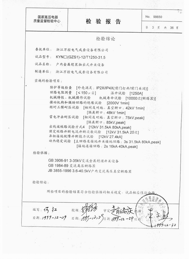 上一篇:安徽明都电气有限公司真空断路器检验报告 下一篇:江苏振光电力设备制造有限公司开关设备检验报告